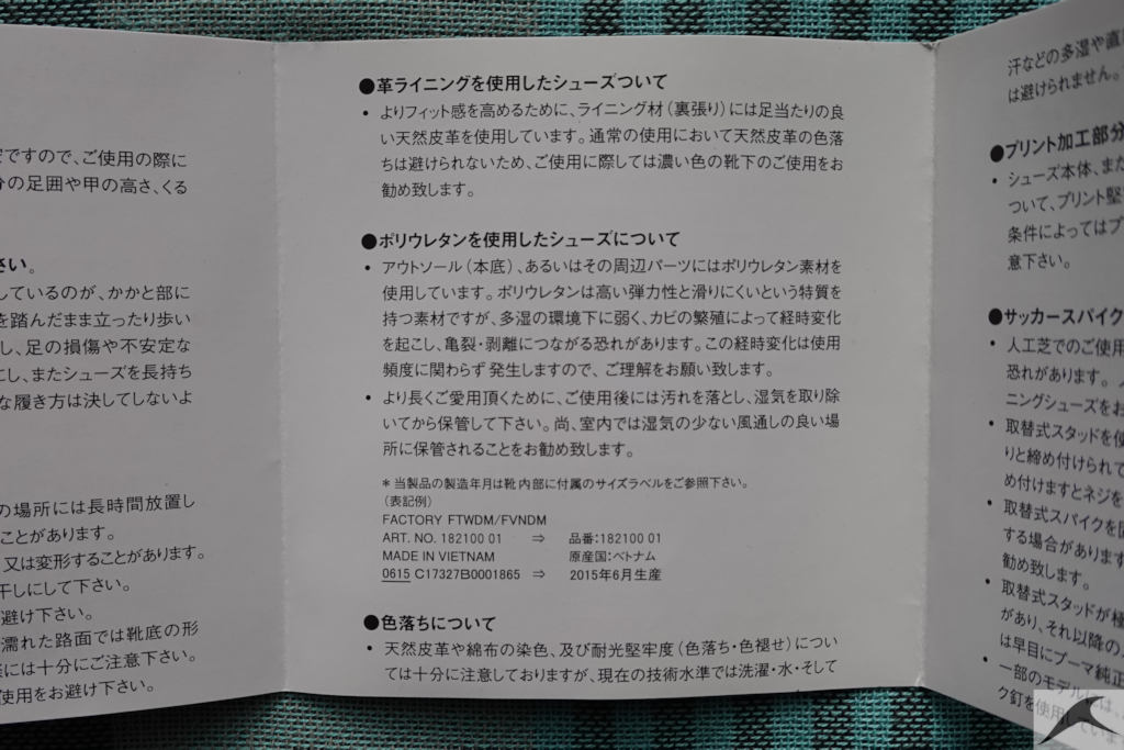プーマ商品付属の注意より引用